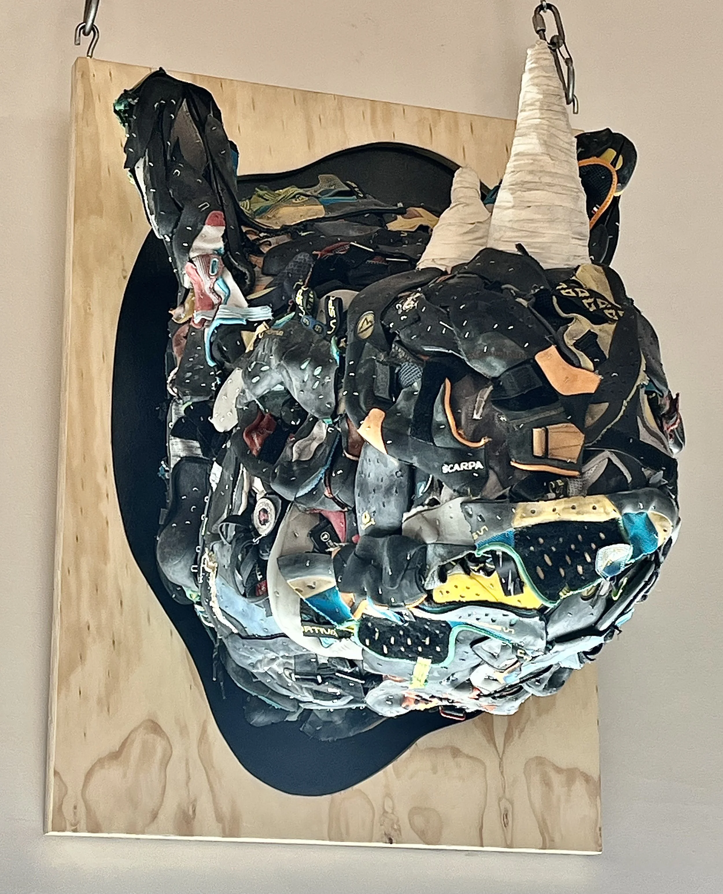 Climbing shoe rhino bust for Movement RINO, Climbing Gym. Climbing shoes, plywood, foam, staples. April, 2025.